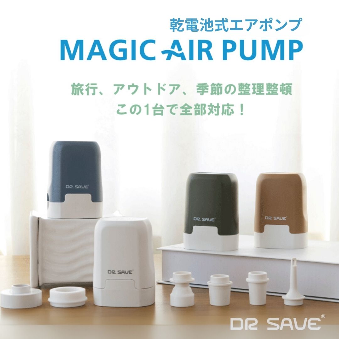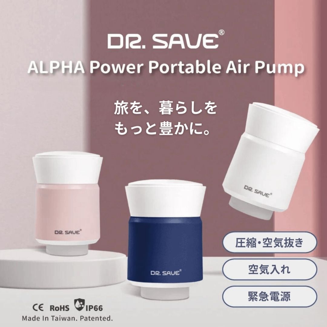 DR.SAVEは、衣類をパワフルに圧縮できる充電式エアポンプです。旅行や出張でのスーツケースのスペース確保はもちろん、クローゼットの整理にも大活躍。