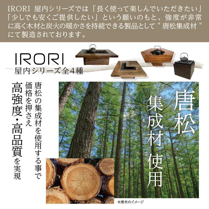 囲炉裏は、火を囲みながら人と人をつなぐ、日本の暮らしの知恵です。炎のゆらぎは心をほぐし、炭火の温もりは空間全体にやさしい時間を生みます。私たちは北海道産カラマツ集成材を採用。寒冷地で育ったカラマツは年輪が詰まり、強度・耐久性に優れます。温かみある木目は炎と調和し、視覚的にも心地よさを演出。間伐材活用は森林保全や地域資源の循環にもつながり、使うほどに環境と地域に貢献できる囲炉裏です。